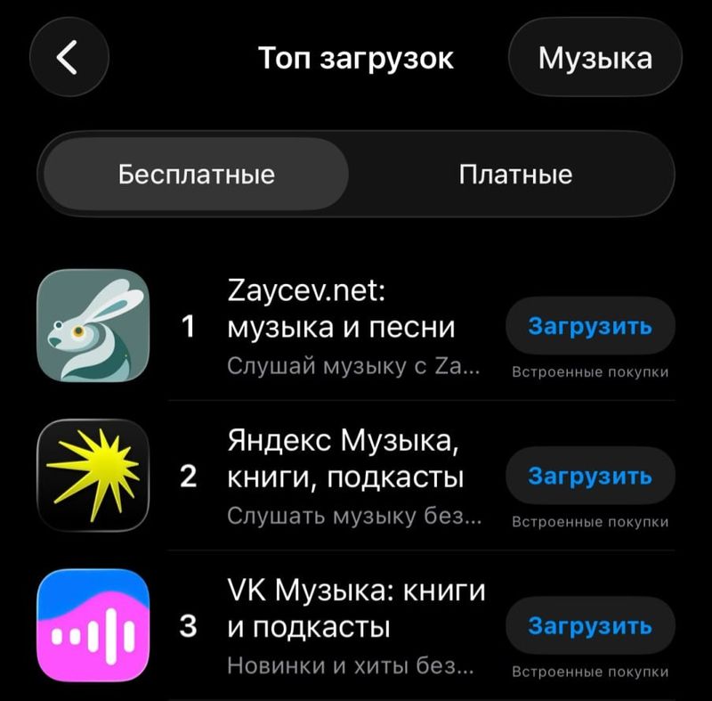 Легендарный Zaycev.Net, известный с 2000-х, неожиданно возглавил рейтинг App Store в категории «Музыка». Пользователи массово скачивают его из-за дешёвой подписки и возможности слушать музыку офлайн без цензуры.