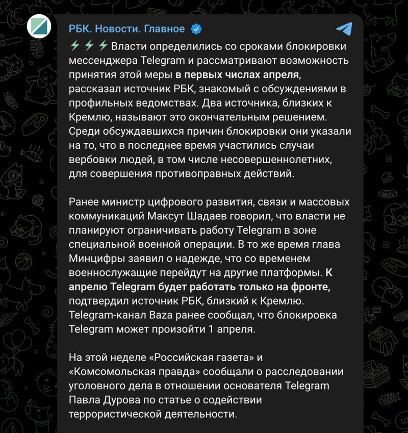 Два близких к Кремлю информатора утверждают, что решение о блокировке Telegram в России окончательное и вступит в силу в начале апреля. Причиной называют участившиеся случаи вербовки людей для совершения противоправных действий через платформу.