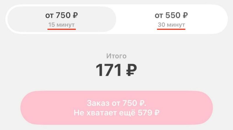 Сервис доставки Самокат вводит новую опцию: можно уменьшить минимальную сумму заказа, согласившись на более долгую доставку. Например, вместо 750 рублей за 15 минут можно заказать от 550 рублей, но ждать около 30 минут.