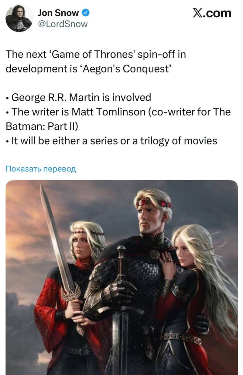 HBO анонсировало новый сериал «Завоевание Эйгона», который станет самым эпичным и затратным проектом во вселенной «Игры престолов». Шоу расскажет о завоевании Вестероса Эйгоном Таргариеном, его драконах и создании Железного трона.