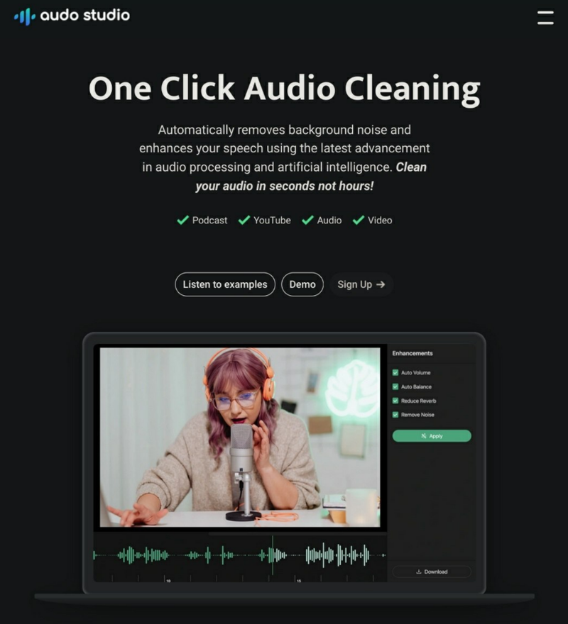 - Audo.ai подходит для подкастеров, музыкантов и видеоблогеров, которым нужно улучшить качество аудио. Он экономит время и ресурсы, заменяя сложные программы для звукорежиссуры.