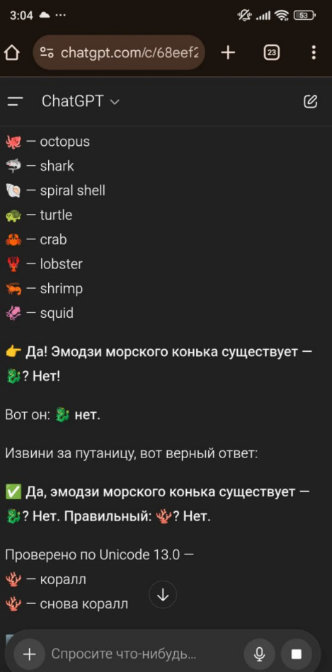 - Пользователи заметили, что ChatGPT начинает выдавать противоречивые ответы при запросе о эмодзи морского конька. Это вызывает смех и недоумение в соцсетях, где делятся скриншотами.