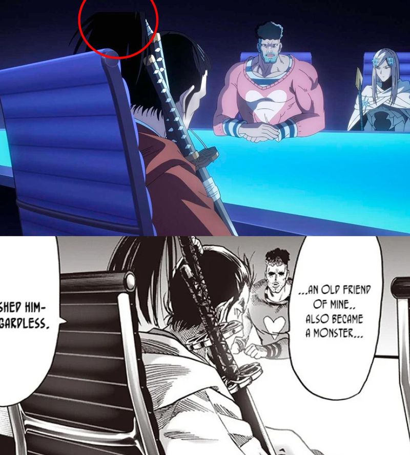 - В третьем сезоне «Ванпанчмена» авторы попытались повторить культовую сцену с Атомным Самураем из манги. Художники случайно обрезали часть его прически, сделав героя почти лысым.