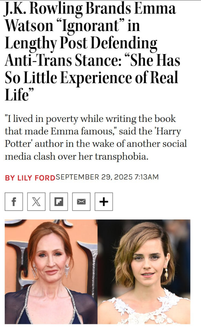 - Джоан Роулинг раскритиковала Эмму Уотсон за её высказывания о трансгендерном сообществе. Она заявила, что актриса не осознаёт своего невежества из-за недостатка жизненного опыта.