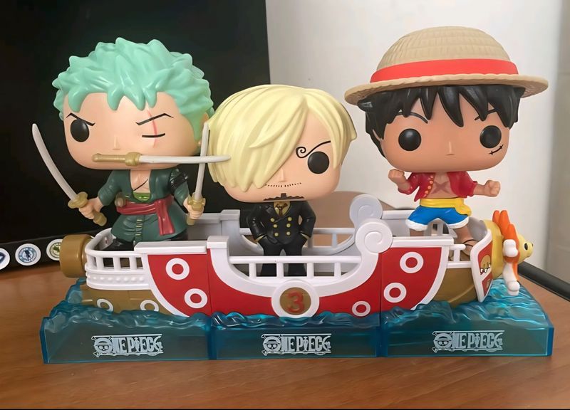 • Фигурки выполнены в стиле Funko Pop, что делает их узнаваемыми и коллекционными. Если собрать все три фигурки, они соединяются в миниатюрный корабль, напоминающий Going Merry.