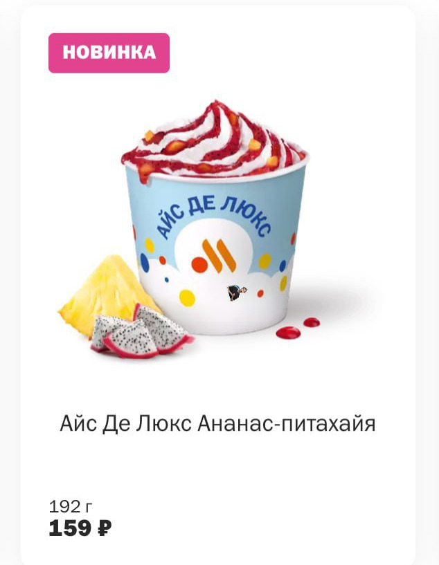 • Сеть Вкусно — и точка добавила в меню мороженое Айс де люкс с экзотическими фруктами. Новинка сочетает ананас и питахайю для освежающего вкуса.