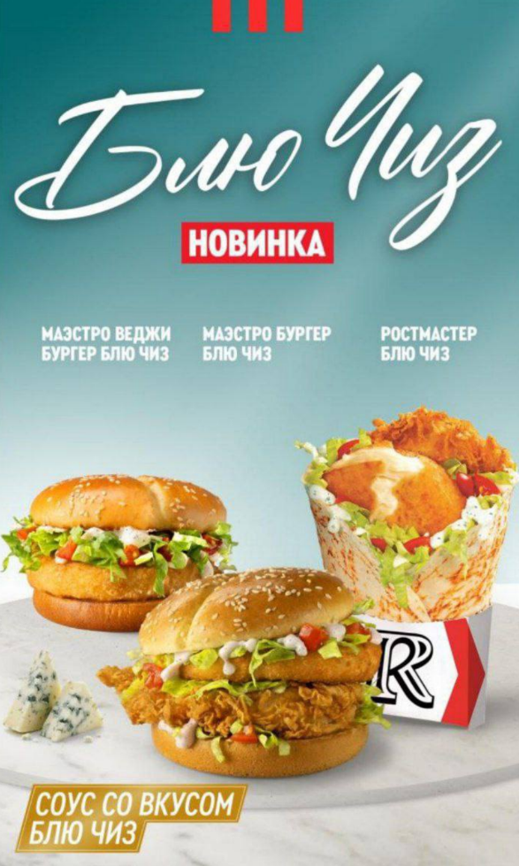 - В дополнение к бургерам сеть предлагает ростмастер с блю чизом. Это сочетание может удивить даже самых смелых гурманов.