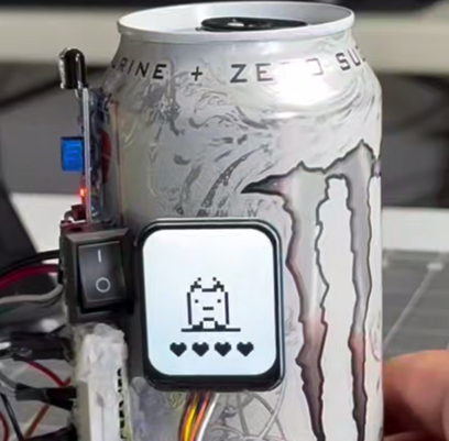 - Девайс работает на базе микроконтроллера и датчиков, которые отслеживают потребление Monster. Каждая банка продлевает жизнь тамагочи на определённое время.
