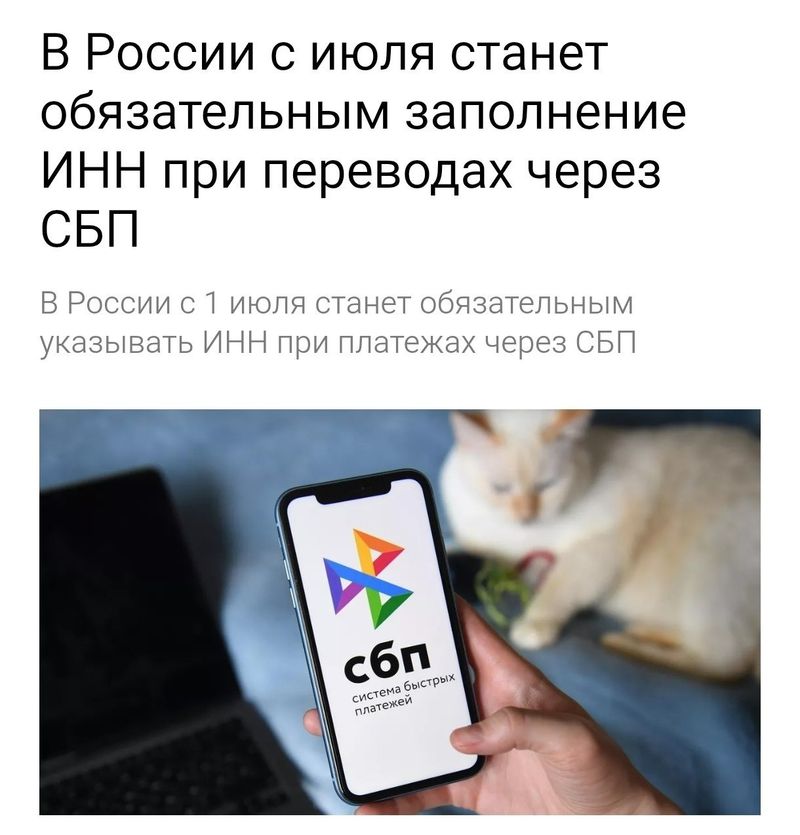 - С 1 июля все переводы через СБП будут требовать указания ИНН отправителя и получателя. Это касается как физических лиц, так и юридических лиц.