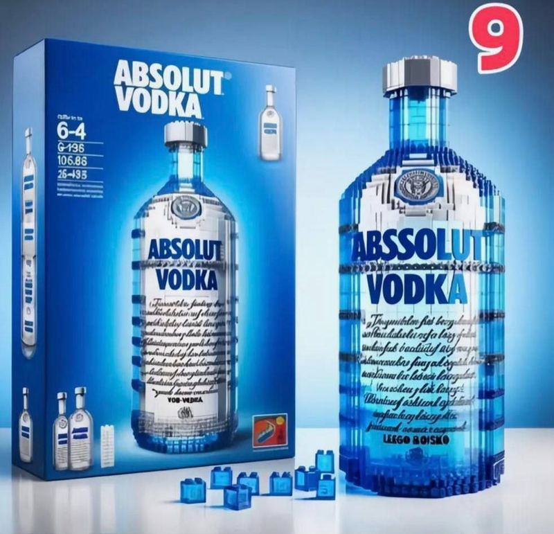 Конструктор позволяет собрать детальную копию бутылки водки Absolut (включая синюю этикетку и узнаваемую форму).