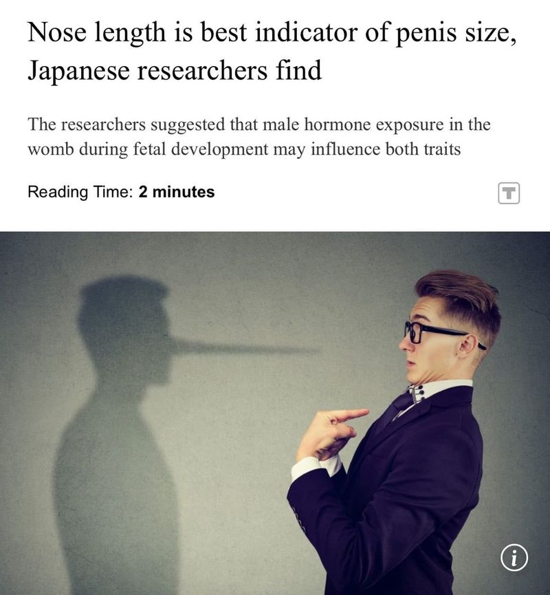 Японские исследователи проанализировали данные 124 мужчин и обнаружили прямую связь между длиной носа и размером пениса. Корреляция объясняется воздействием мужских гормонов во время внутриутробного развития.