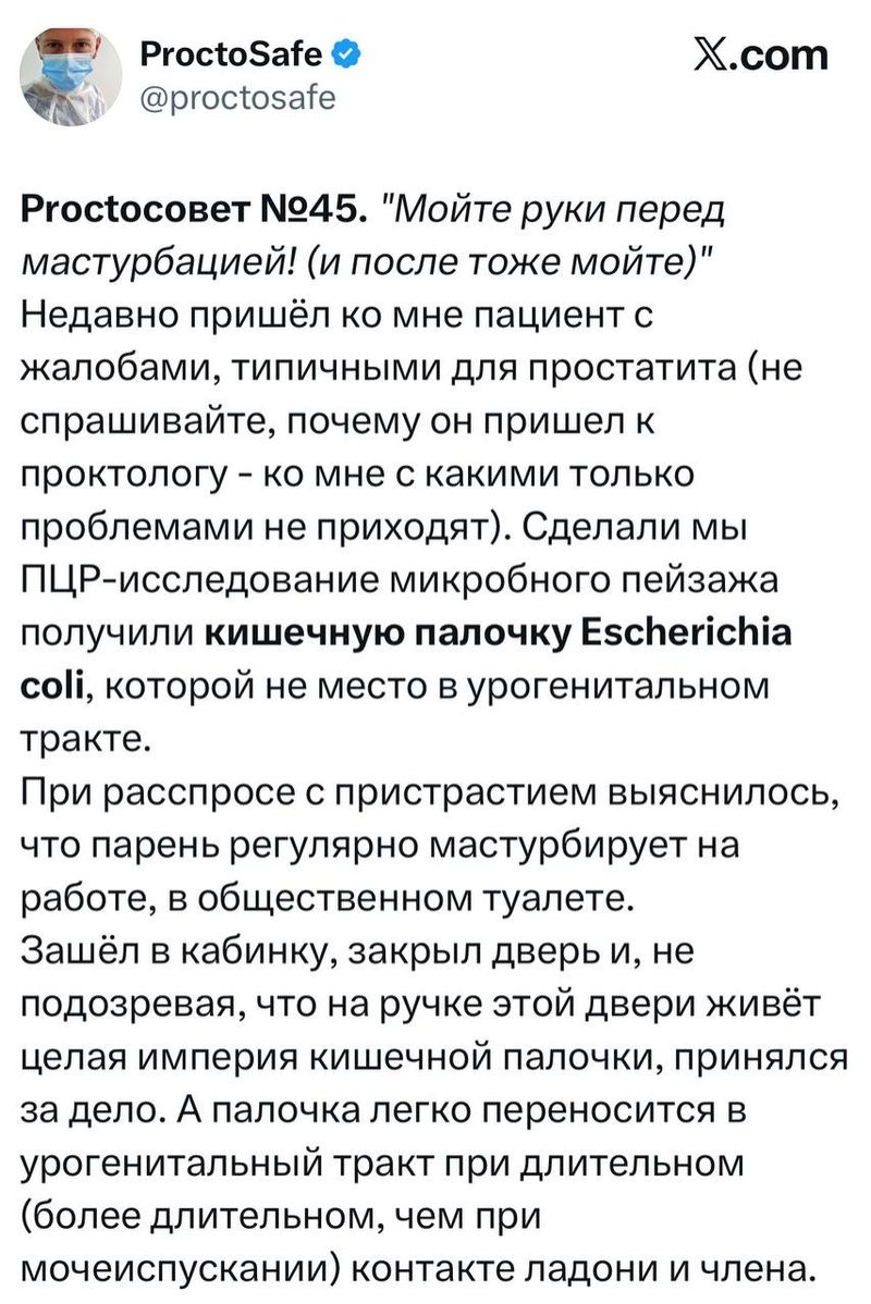 Проктолог из Twitter рассказал о пациенте, который заработал простатит из-за кишечной палочки после мастурбации в туалете на работе. Врачи предупреждают о рисках и дали рекомендации по гигиене.