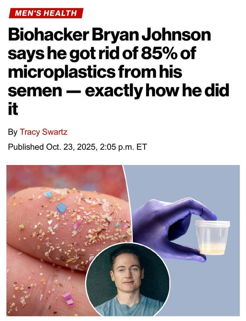 Миллиардер-биохакер Брайан Джонсон заявил, что снизил концентрацию микропластика в своей сперме с 165 до 20 частиц на миллилитр. Он использует сауну с пакетом льда, фильтры и отказ от пластика, но учёные предупреждают об отсутствии исследований.
