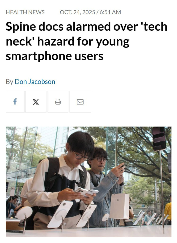 - Зависимость от смартфонов приводит к развитию шейного остеохондроза у молодых пользователей. Врачи называют это состояние "техношеей" и сравнивают его с тихой пандемией.