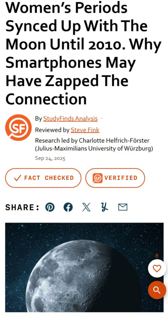 Исследование показало, что до 2010 года менструальные циклы часто синхронизировались с лунными фазами, но светодиодное освещение и гаджеты нарушили эту связь.