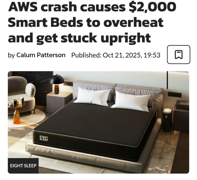 - Из-за сбоя в облачной инфраструктуре Amazon кровати Eight Sleep нагрелись до 43 градусов ночью. Пользователи просыпались в ужасе, обезвоженные и потные, будто в сауне.