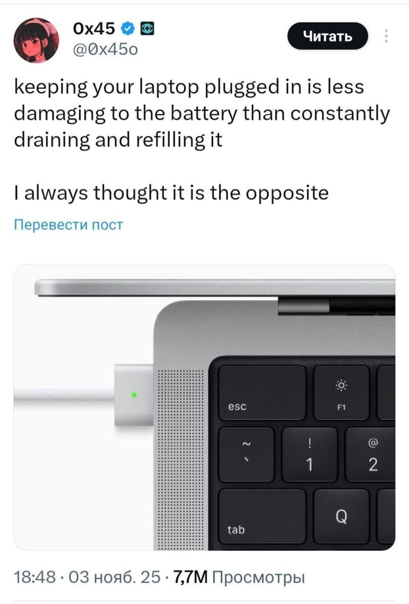 Оказывается, современные ноутбуки с контроллером заряда лучше чувствуют себя на постоянной зарядке, чем в режиме полной разрядки. Это переворачивает все наши представления о заботе о батарее.