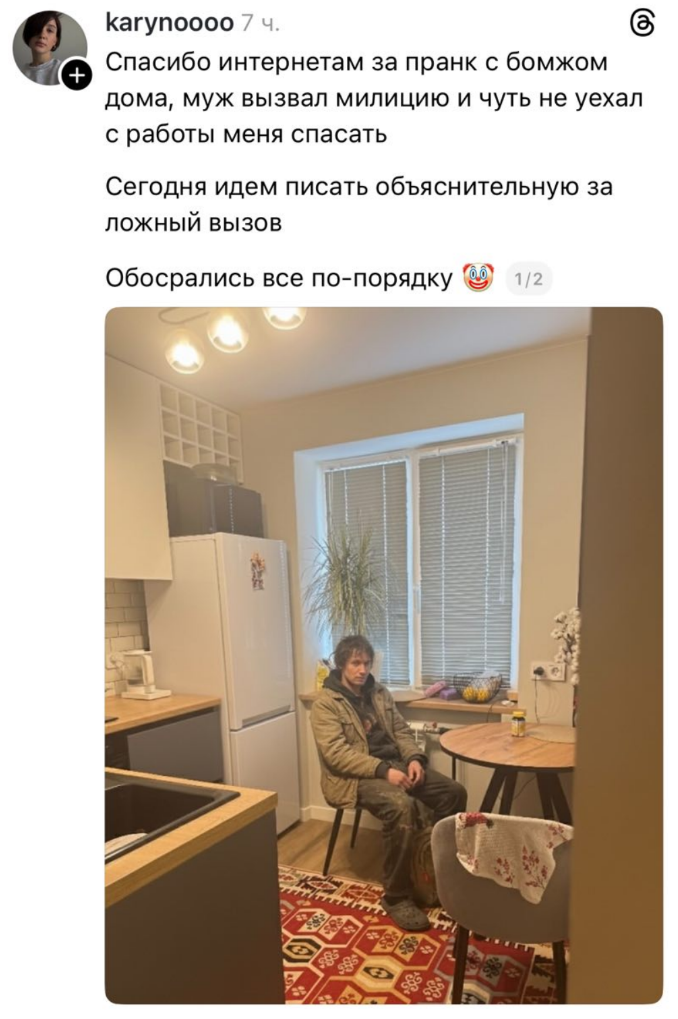 Вчера в сети завирусился пранк, где люди генерировали фото с бездомным в своей квартире, чтобы разыграть близких. Одна девушка решила повторить это с мужем, но все пошло не по плану — муж вызвал полицию, и ей пришлось давать объяснения.