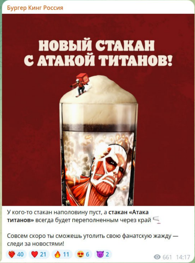 - Бургер Кинг готовится выпустить эксклюзивные стаканы с персонажами из «Атаки титанов». Эта акция стартует в ближайшие недели и продлится ограниченное время.
