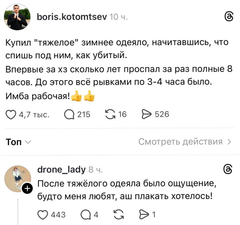 - Тяжёлые одеяла стали хитом в соцсетях благодаря их способности ускорять засыпание. Люди делятся восторженными отзывами, сравнивая ощущения с объятиями.