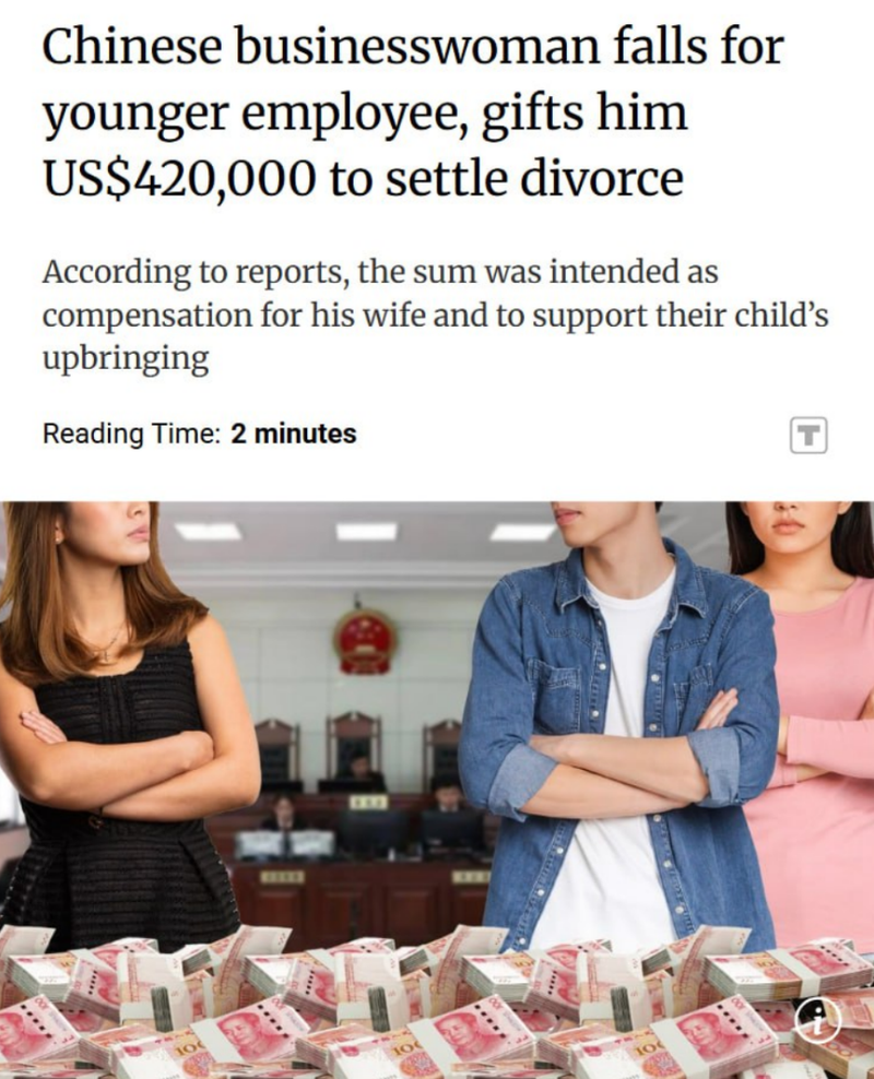 - Китайская бизнес-вумен увлеклась своим подчинённым и решила ускорить его развод. Она перевела его жене $420'000 в качестве компенсации за расторжение брака.