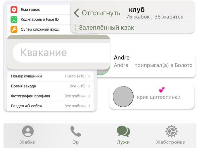 - Названия пунктов меню меняются на забавные варианты вроде "Квак-чат" или "Лягушачья почта". Поле для сообщений тоже получает обновленный дизайн с зелеными элементами.