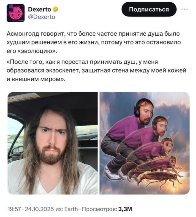 Популярный блогер Asmongold раскритиковал ежедневный душ, назвав его худшим решением в жизни. Он утверждает, что долгое отсутствие мытья создаёт защитный «экзоскелет» на коже, что делает человека более «эволюционировавшим».