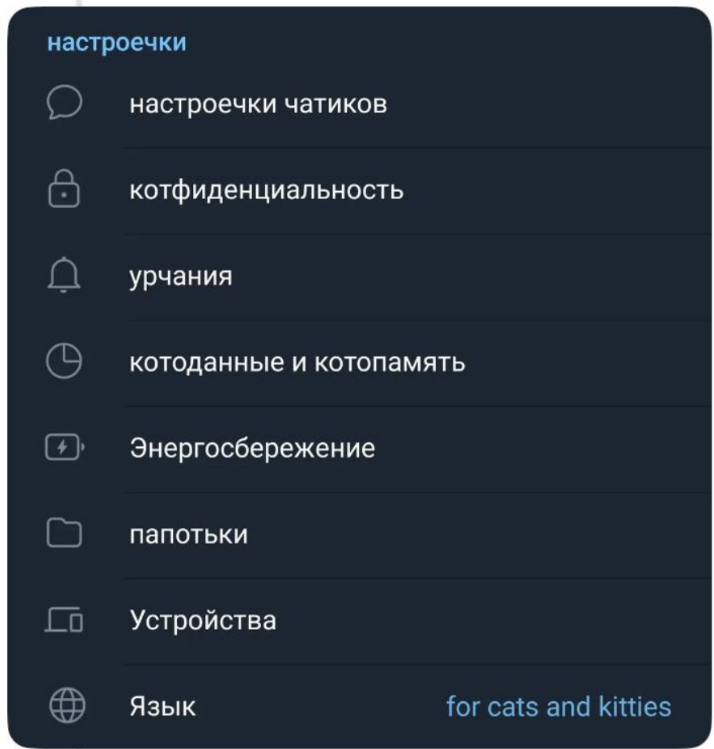 - Для кошачьего языка нужно перейти по ссылке https://t.me/setlanguage/forcatsandkitties, чтобы активировать изменения в интерфейсе. Это позволяет быстро переключаться между языками в зависимости от настроения.